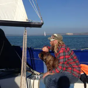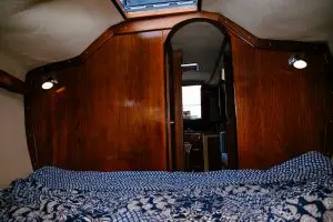 Cabin space below is huge and the boat was used as a live aboard for 2 people and a four legged sailor. Sudana has space to sleep 4 people comfortably or 6 people for a cosy weekend. The cabin is split into 3 sections with a large forward V double berth, heads and cupboards midships, main saloon with 2 single bench berths either side, a double pilot/quarter berth starboard aft by the nav station and galley port aft. The main saloon has 6’ft headroom and seating for a lot of friends around the central folding wooden dining table. Our best was 8 people and three dogs for an evening of eating, drinking and boat talk.