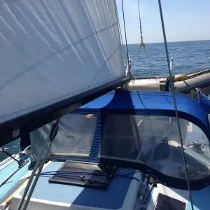 Sudana is a mast head sloop that is easy to handle for two people. The cockpit is deep and feels very secure, there are companionway steel grab rails and harness points. There was a large spray hood but this has been removed as it’s condition is poor. We will either have it replaced or this can be negotiated with the buyer. There are spray dodgers which share the same fate. At the stern are two rather substantial davits with falls for the Honwave inflatable dinghy and fixed transom boarding ladder. A manual diaphragm bilge pump is situated next to the cockpit locker. Sudana has a transom hung rudder, hung via three stainless steel gudgeon/pintle assemblies and extendable tiller with auto pilot fittings. The Autopilot is a Simrad. Simbad the extra sailor works great on long passages and is a much needed extra pair of hands for single handed sailing, his only downfall is his attraction to large metal bouys in a channel.