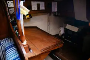 The two cylinder raw water cooled diesel engine has always performed as expected and pushes her along at a respectable 5 knots. A single lever control is installed in the cockpit and is easily controlled by foot for docking manoeuvres. She has a folding prop for speed under sail and have never had any problems. The engine has been DIY serviced and is accessed via an acoustically insulated panel behind the companionway ladder in the saloon.
